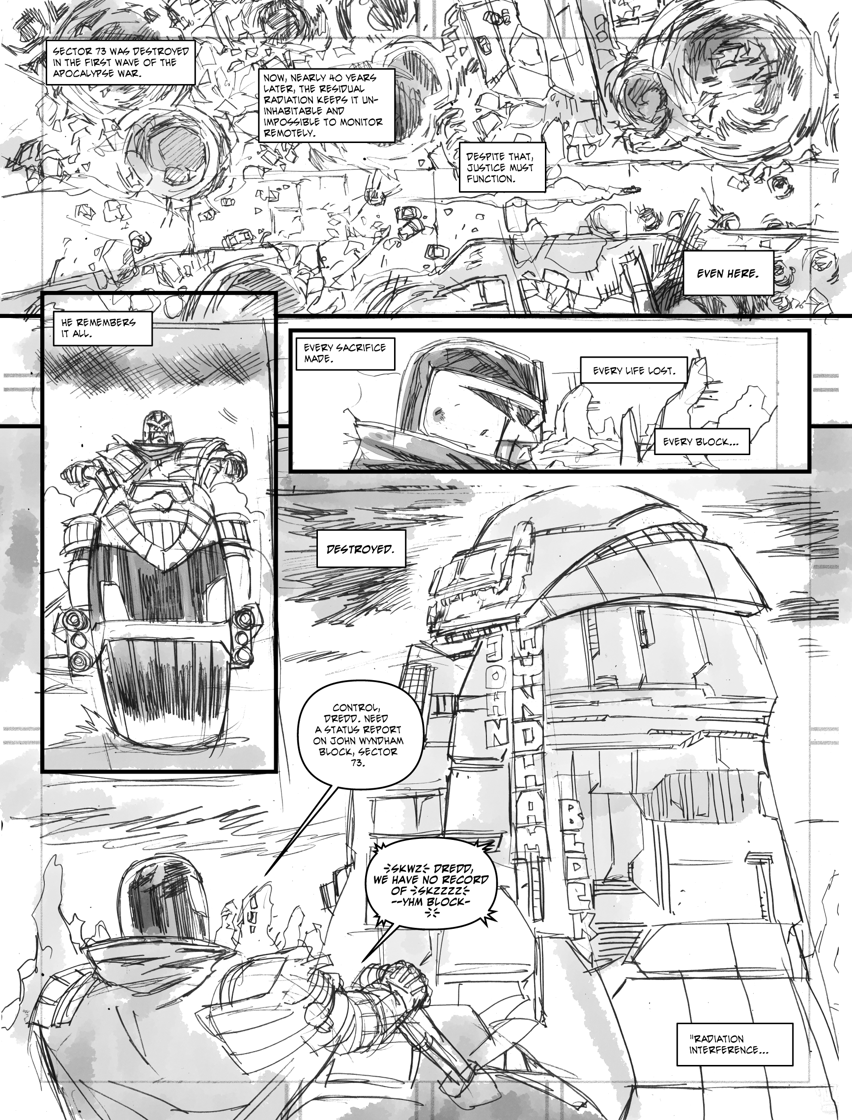 And here’s the raw pencils for page 1… Scanned and tidied, added panel borders, resize a couple of things, made panel 2 push into panel 2 to just force the readers eye a bit to that panel (I had planned to have Dredd’s head here jut out of the panel, but that would have made it hard to place lettering)