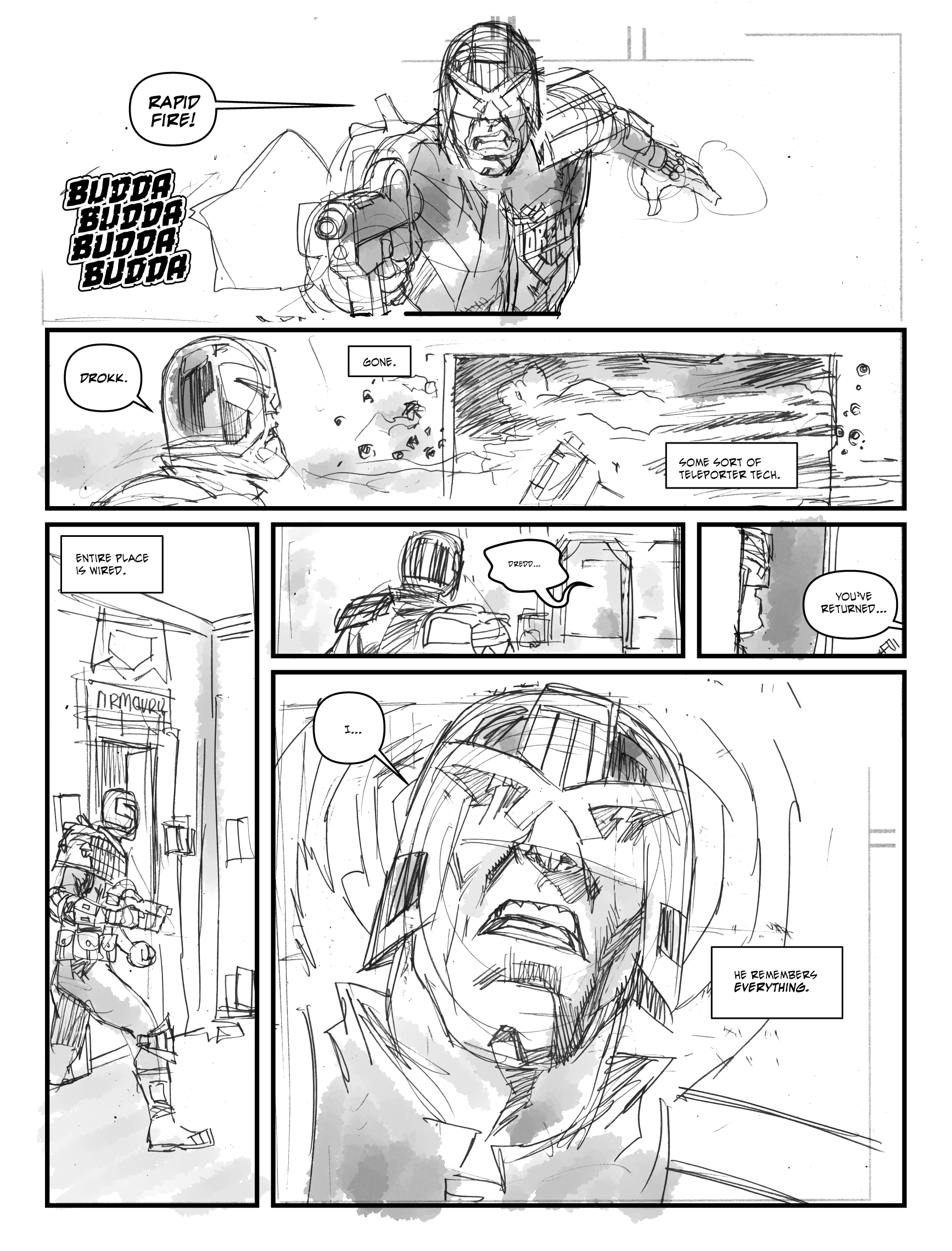 (As an aside: these are pretty tight for pencils from me, but if I were inking them and had more time [the constant enemy] I’d spend more time on some of those Dredd faces – this is me acknowledging that last face is not great)